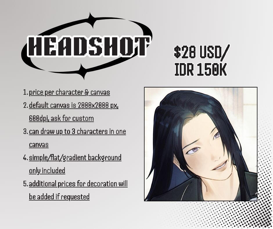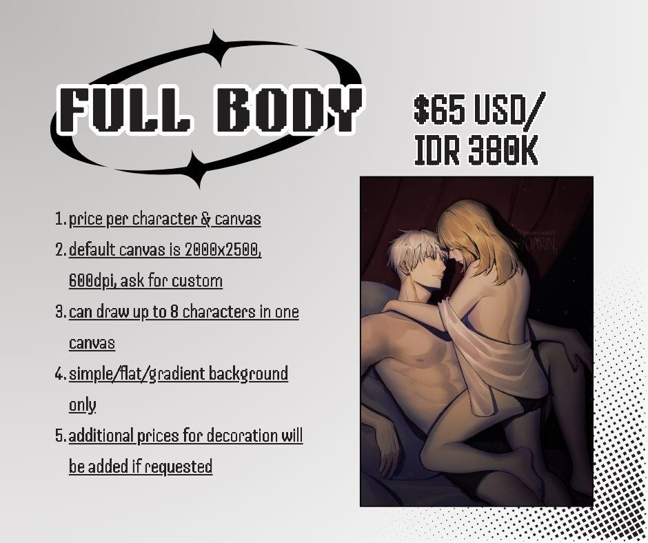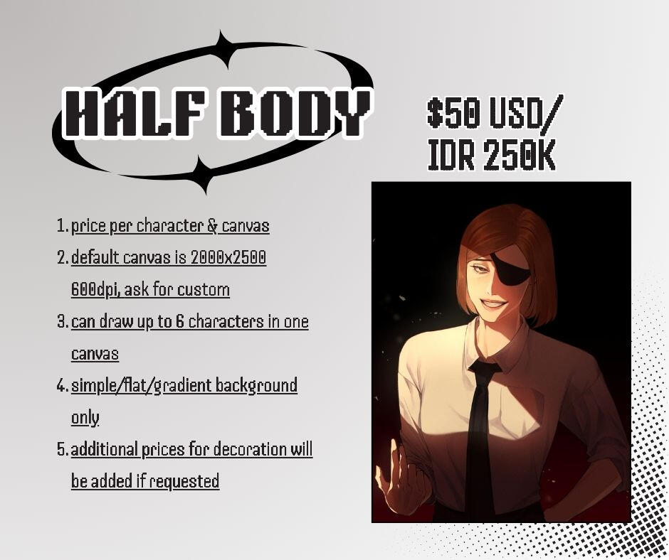 after i accept your commission request, send me your request details and references including: pose, color palette (you can choose to use my color palette), outfit, facial expression, decoration, background, and other character references if needed.
